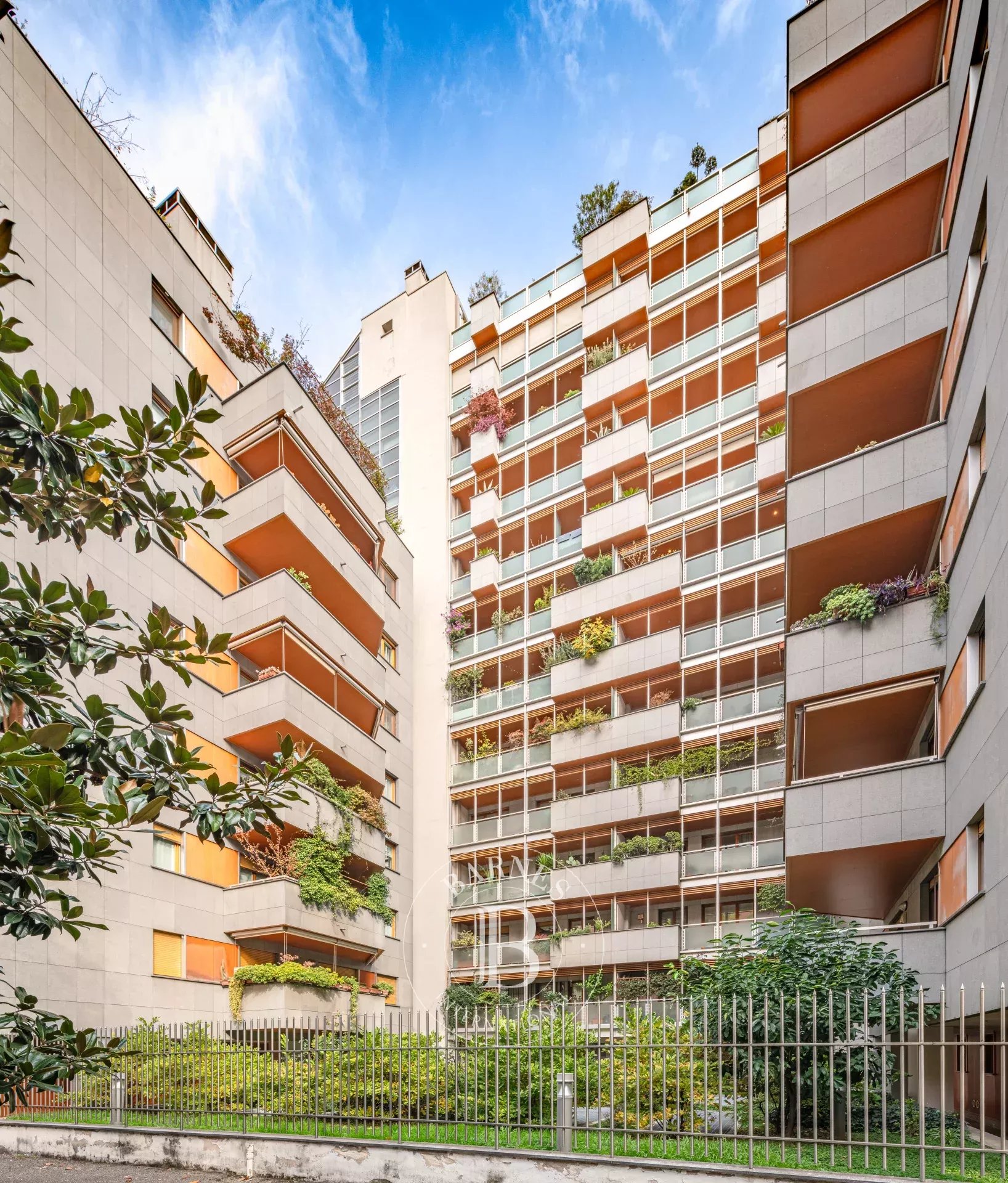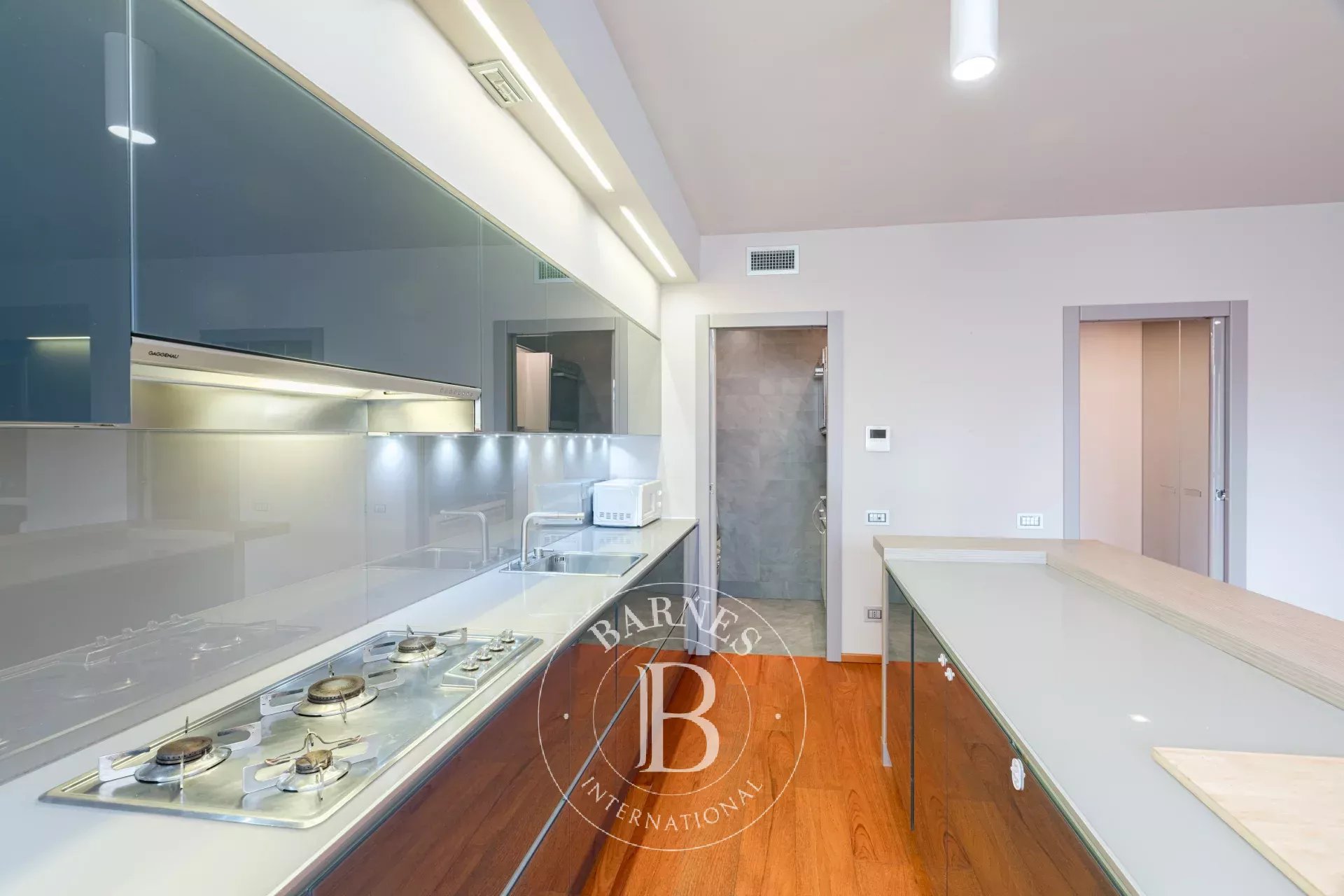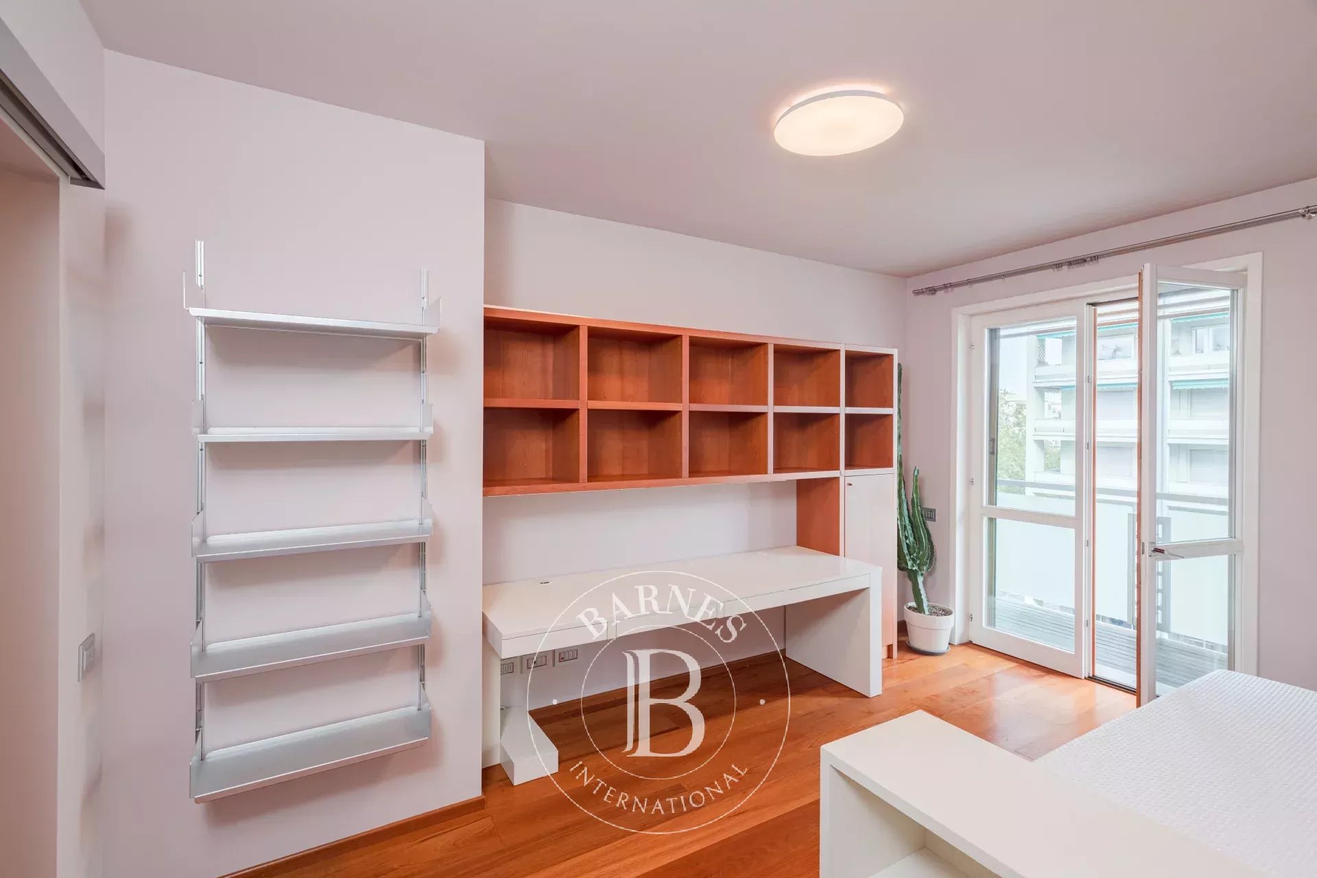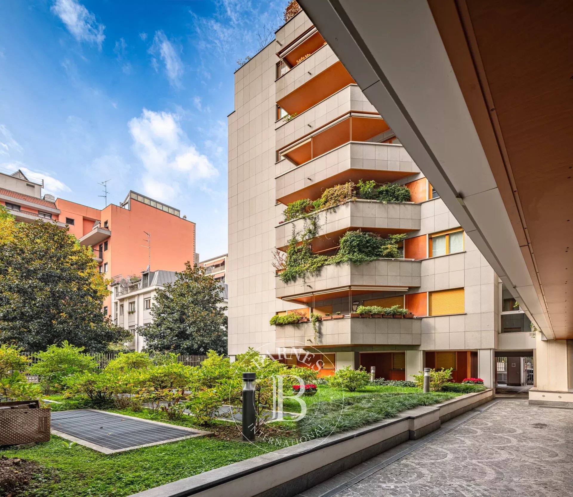 L'appartement est fini avec des matériaux et des meubles haut de gamme : portes Rimadesio, armoires Lema, bibliothèques De Padova, canapé Frau et appareils électroménagers Miele. Parquet, châssis en bois avec double vitrage, chauffage, climatisation et eau chaude centralisés.