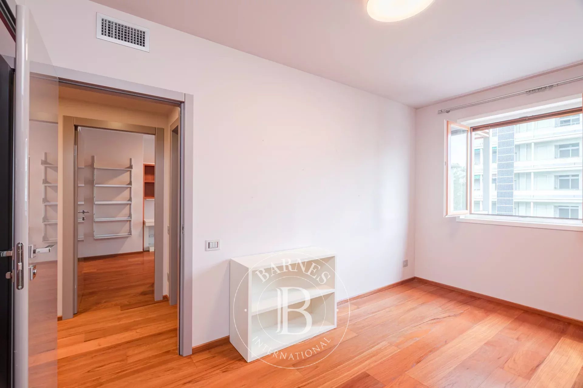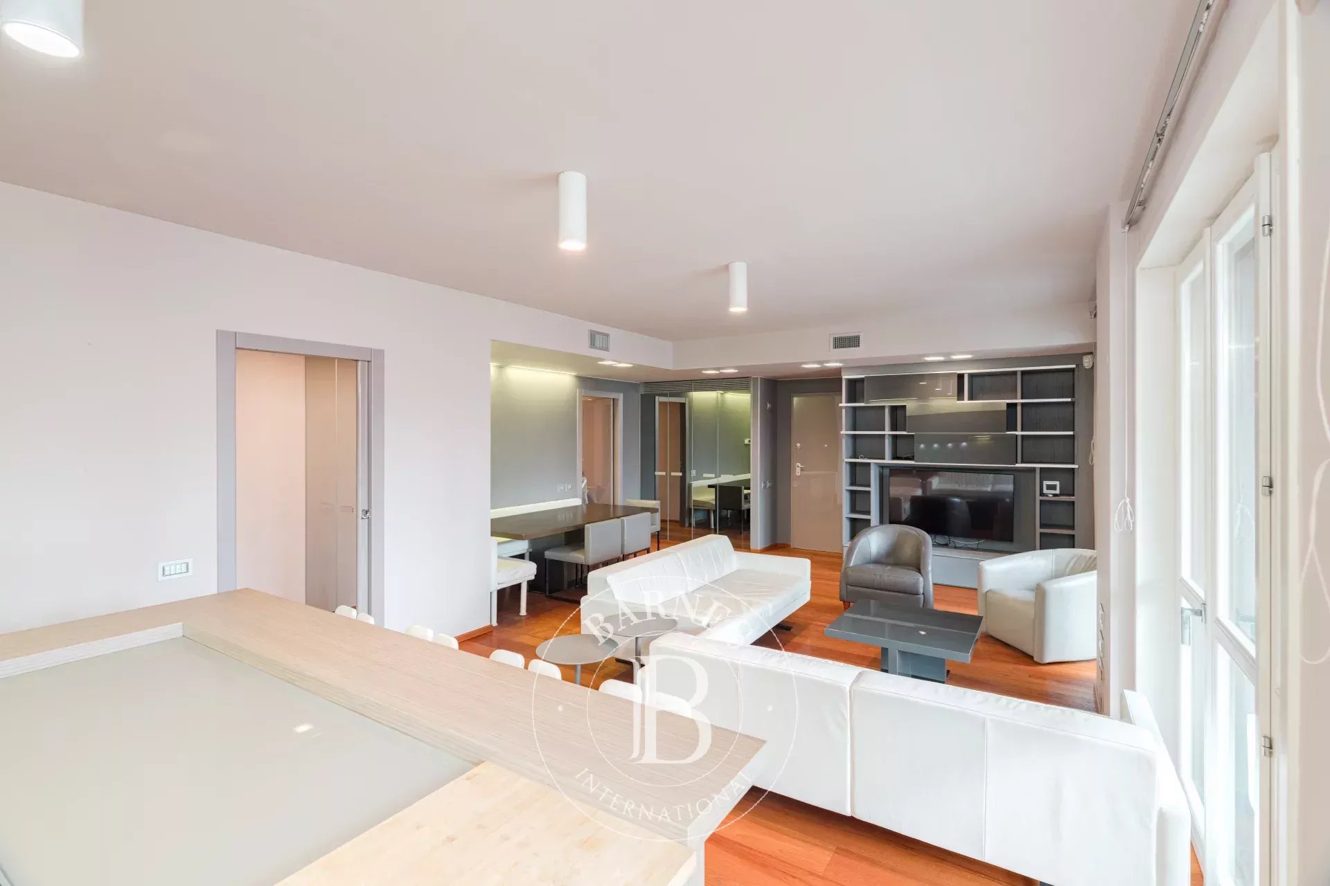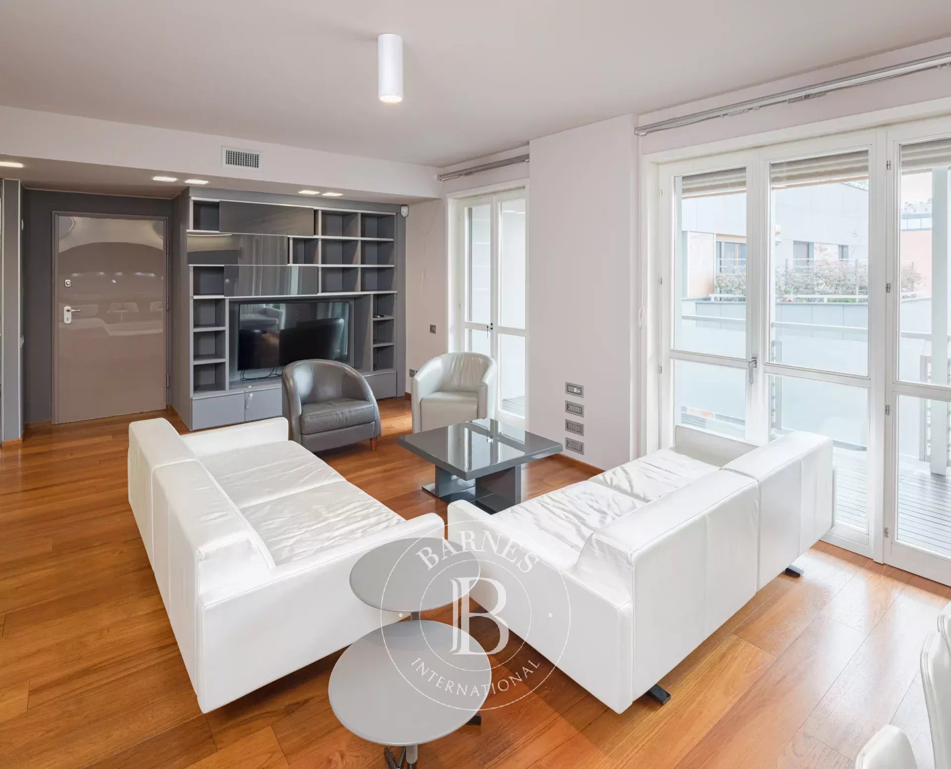 L'appartement est fini avec des matériaux et des meubles haut de gamme : portes Rimadesio, armoires Lema, bibliothèques De Padova, canapé Frau et appareils électroménagers Miele. Parquet, châssis en bois avec double vitrage, chauffage, climatisation et eau chaude centralisés.