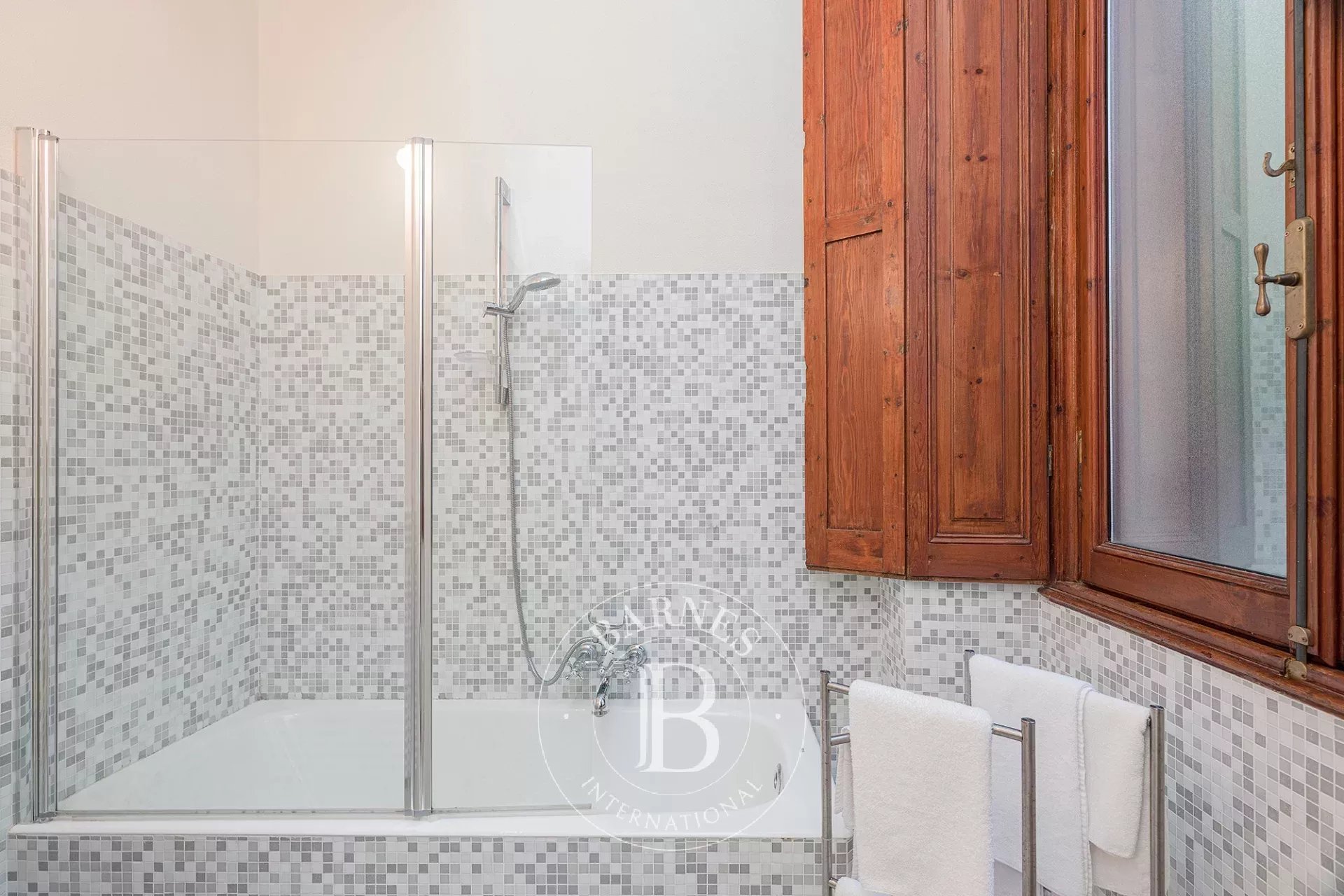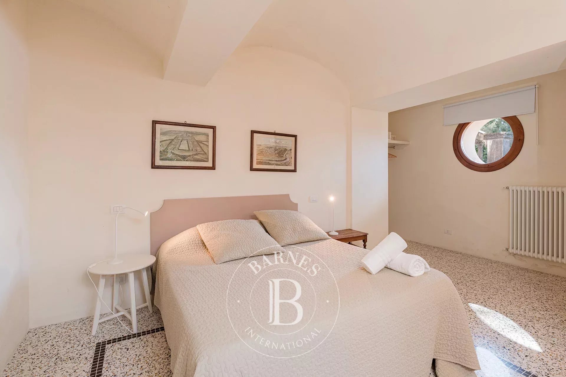 L’appartamento ha una superficie interna di circa 190 mq è distribuito su due livelli, ognuno con accesso indipendente. Al piano superiore un ingresso signorile conduce all’ampio soggiorno con cucina a vista, impreziosito da pavimenti alla veneziana e soffitti affrescati, dal quale si accede direttamente ad una balconata coperta con vista mare. Al piano è presente una camera matrimoniale con un bagno finestrato. Il piano terra, al livello inferiore, ospita due ulteriori camere matrimoniali con accesso al patio e ad un giardino privato di circa 140 mq e servite da un secondo bagno completo.